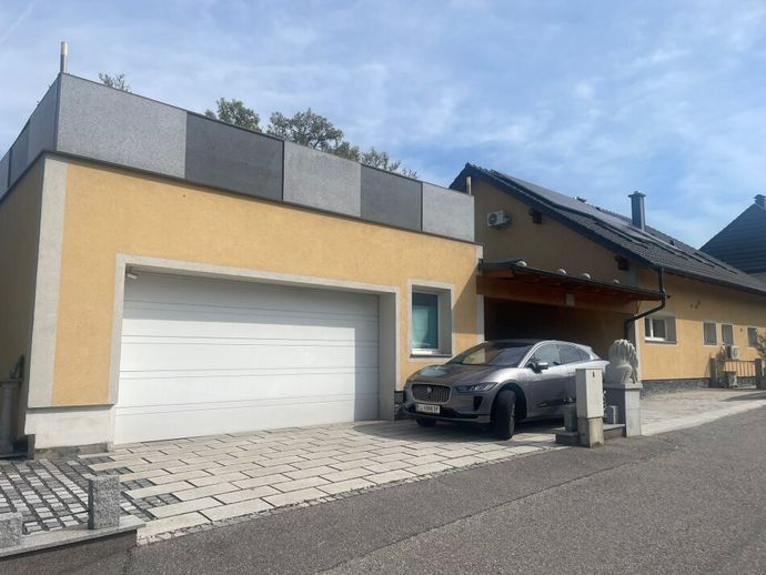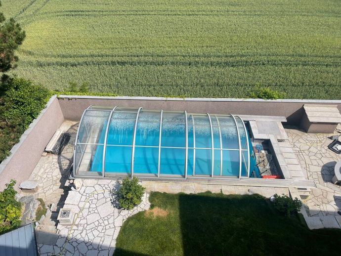 Im Garten wartet ein hochwertiger Pool auf entspannte Stunden im Sommer. Für Fahrzeuge stehen eine Doppelgarage, ein Doppelcarport sowie zwei Außenstellplätze direkt vor dem Haus zur Verfügung.