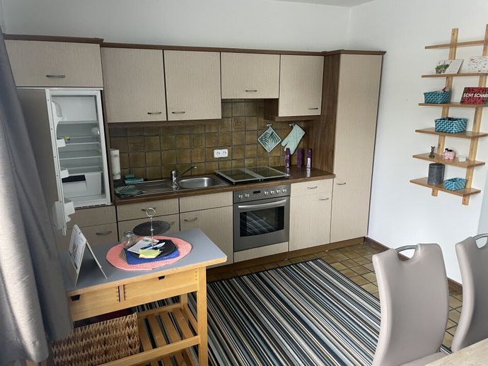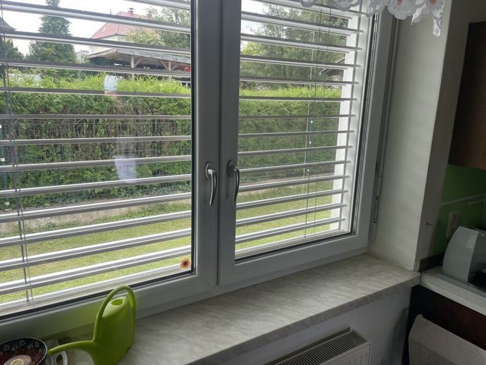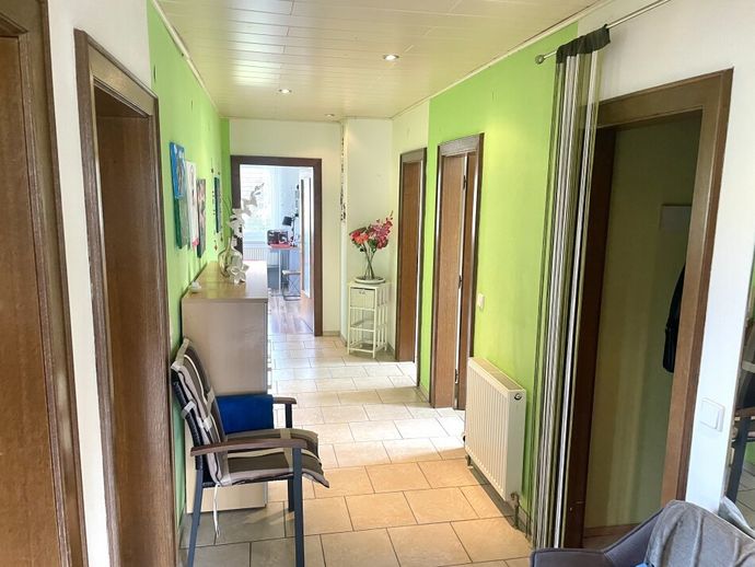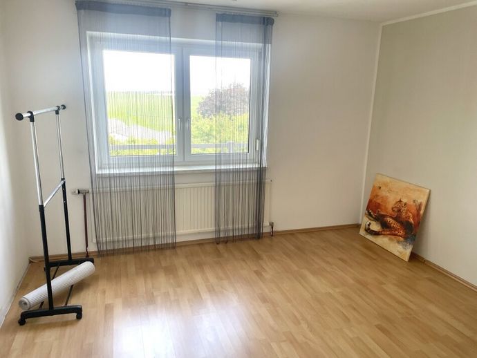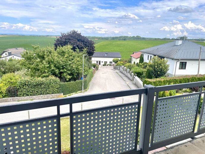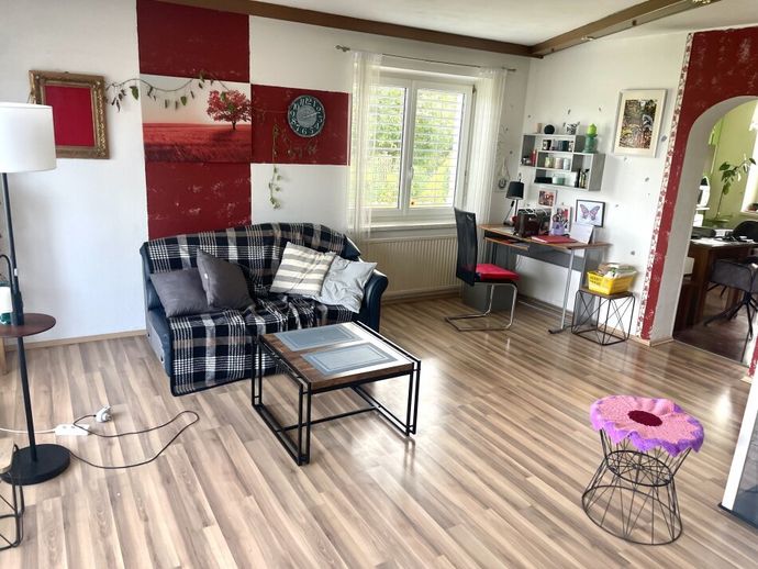 Im Obergeschoss befindet sich ebenfalls eine geräumige Familienwohnung mit 3 Zimmern sowie Vorraum, Küche mit Essbereich, Abstellraum, WC und Bad. Das Wohnzimmer ist mit einem Balkon mit Grünblick ausgestattet.